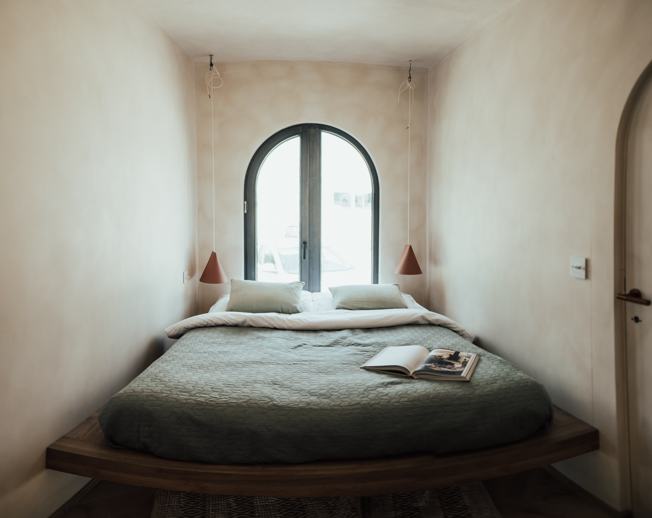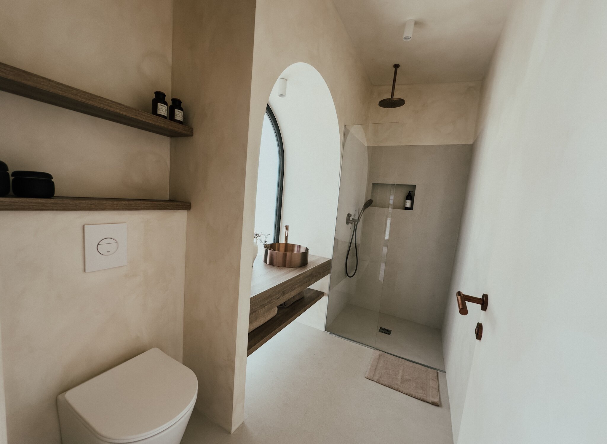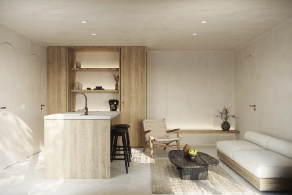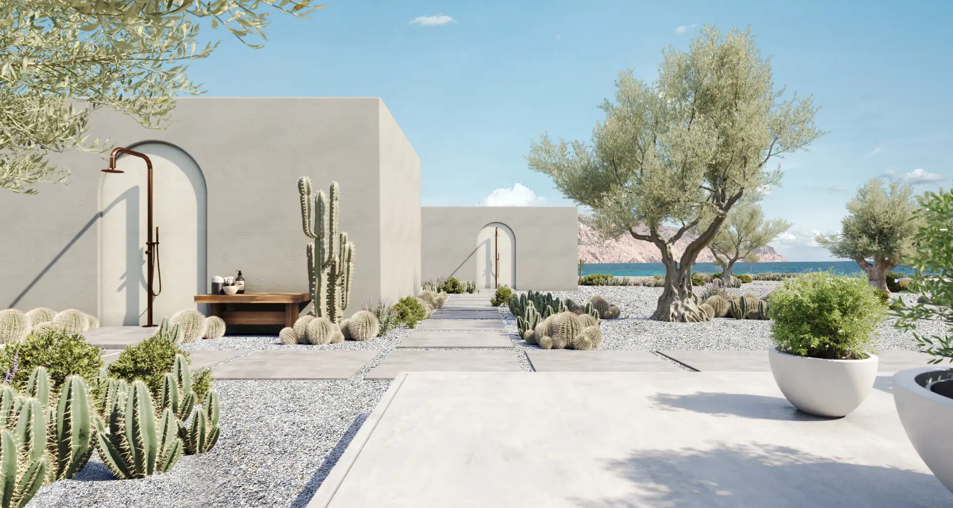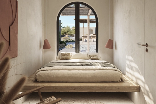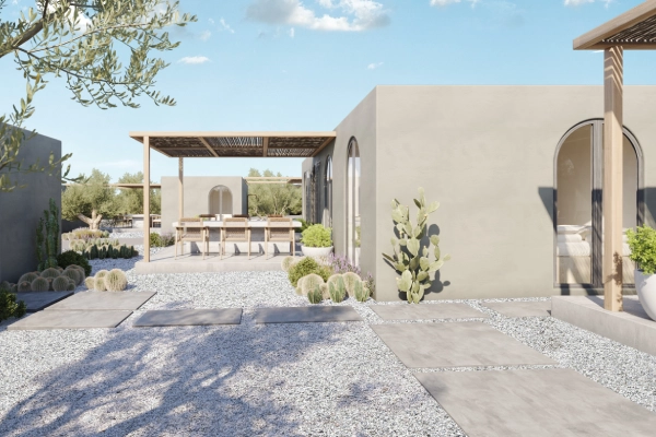 Arched doorways and windows, limewash walls, a microcement facade, and terra-cotta additions showcase architectural elegance inspired by the natural surroundings.