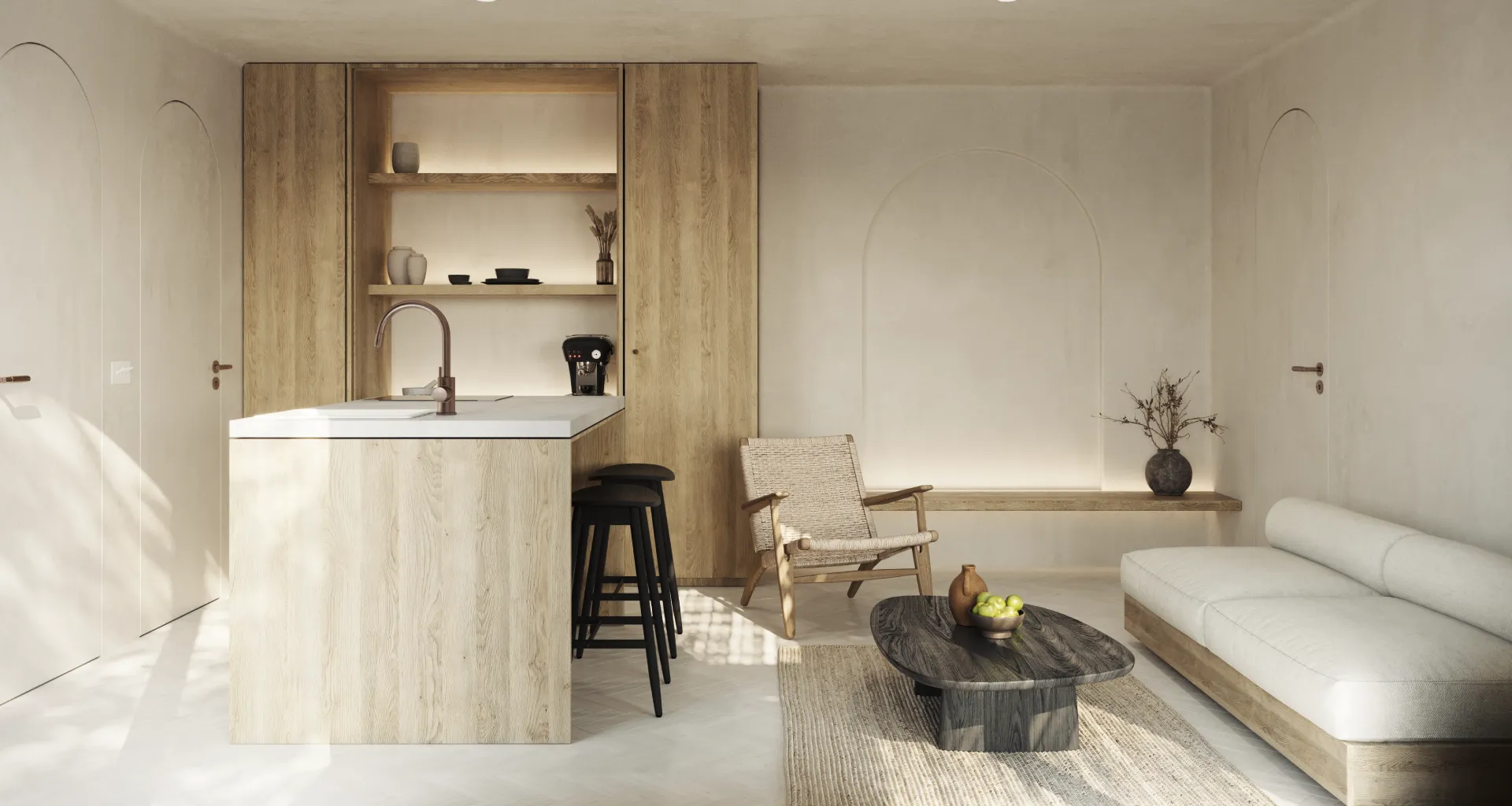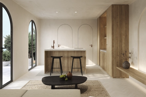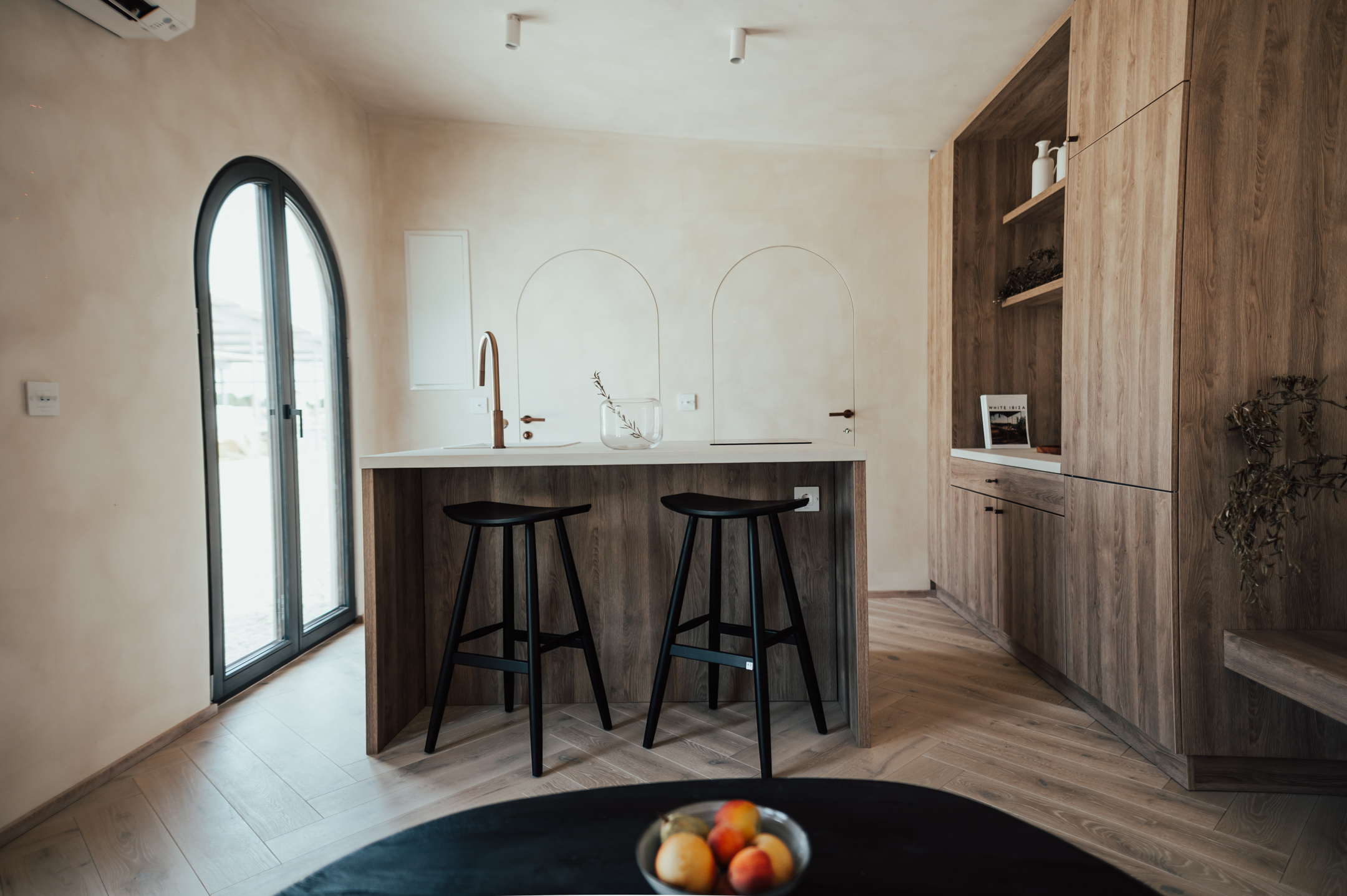Unleash your culinary creativity in a kitchen adorned with natural materials—wood, bronze faucet, and microcement—creating an environment that resonates with earthy charm.